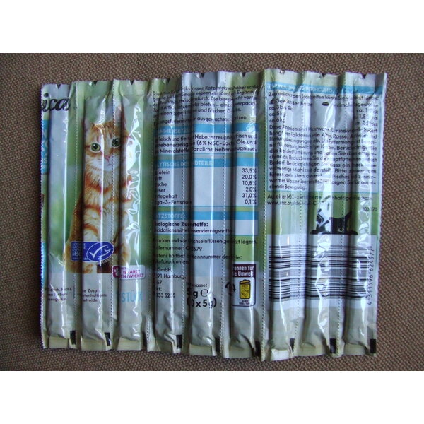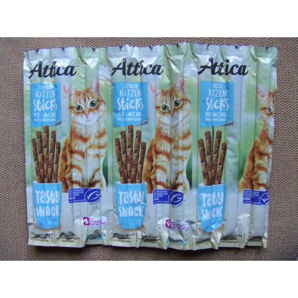 9 Sticks der Sorte Attica Katzen-Sticks mit Lachs. Mein wählerischer Kater mag sie leider nicht.