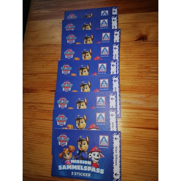 9 Päckchen mit je 3 Sticker der aktuellen Paw Patrol- Sammelaktion „Mission Sammelspass“ von Aldi Nord.