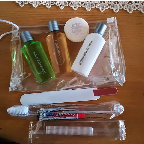 9 teiliges Beautyset / Reiseset mit Kosmetiktasche für die Reise, bestehend aus Duschlotion, Haarshampoo, Körperlotion, Seife, Zahnbürste, Zahnpasta, Nagelfeile, Kamm und Täschchen.