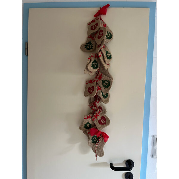 Adventskalender zum Aufhängen aus 24 kleinen nummerierten Jutesäckchen.