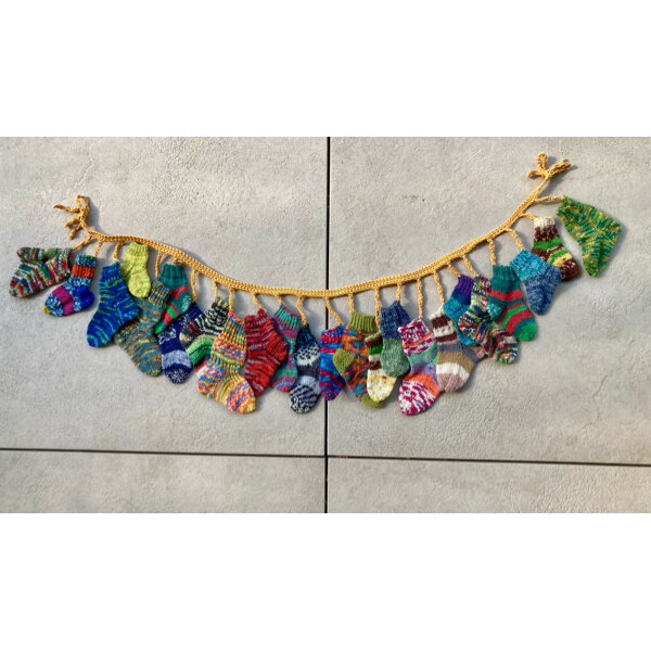 24 verschiedene Söckchen in verschiedenen Größen von 8 bis 12cm Fußlänge hängen an einer gehäkelten Schnur von 90cm Länge und können befüllt werden. Die Buttons mit den Zahlen lege ich dazu, dann können sie verteilt werden wie man das mag.