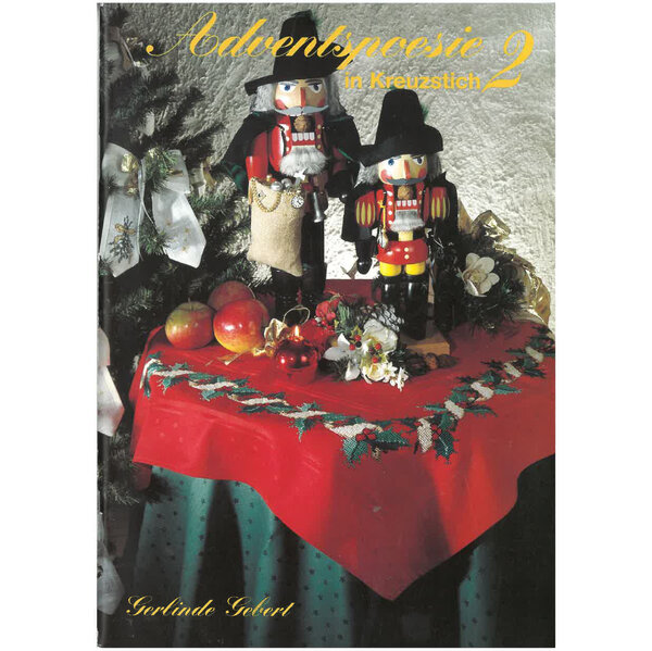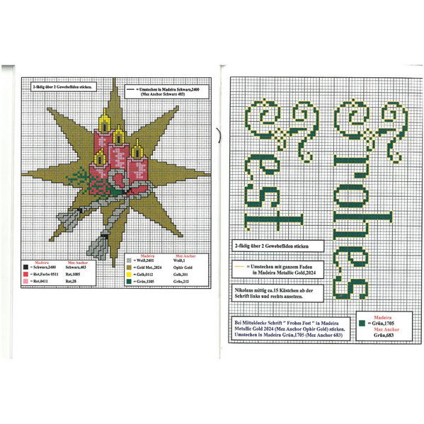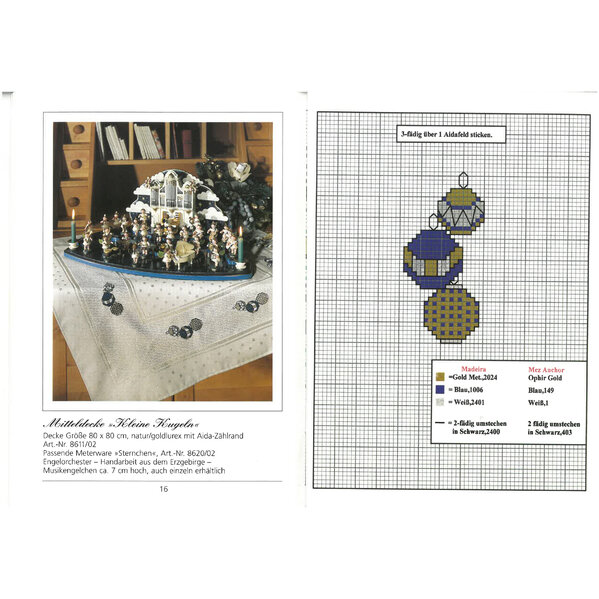 Hier sind viele Kreuzstich-Arbeiten rund um das Thema Advent farbig abgebildet. Die Stickmuster und Farbcodes sind ebenfalls in Farbe zu sehen.