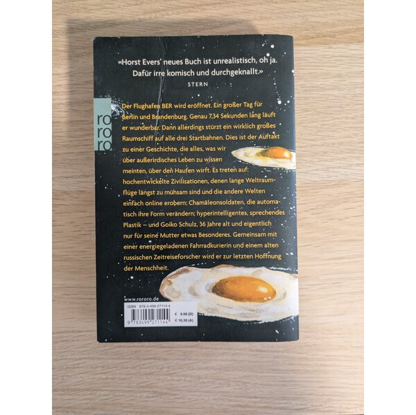 Der Flughafen BER wird eröffnet. Ein großer Tag für Berlin und Brandenburg. Genau 7,34 Sekunden lang läuft er wunderbar. Dann allerdings stürzt ein wirklich großes Raumschiff auf alle drei Startbahnen. Dies ist der Auftakt zu einer Geschichte, die alles, was wir über außerirdisches Leben zu wissen meinten, über den Haufen wirft. Es treten auf: hochentwickelte Zivilisationen, denen lange Weltraumflüge längst zu mühsam sind und die andere Welten einfach online erobern; Chamäleonsoldaten, die automatisch ihre Form verändern; hyperintelligentes, sprechendes Plastik – und Goiko Schulz, 36 Jahre alt und eigentlich nur für seine Mutter etwas Besonderes. Gemeinsam mit einer energiegeladenen Fahrradkurierin und einem alten russischen Zeitreiseforscher wird er zur letzten Hoffnung der Menschheit.