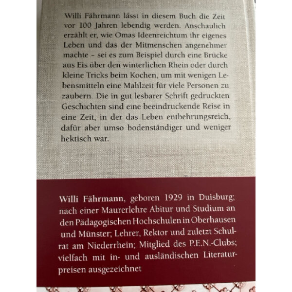 In den Geschichten dieses Buches, gedruckt in gut lesbarer Schrift, lässt Willi Fährmann die Zeit vor 100 Jahren lebendig werden. Anschaulich erzählt er, wie Omas Ideenreichtum ihr eigenes Leben und das der Mitmenschen angenehmer machte - sei es zum Beispiel ducht eine Brücke aus Eis über den winterlichen Rhein oder durch raffinierte Tricks beim Kochen, um mit wenigen Lebensmitteln eine Mahlzeit für viele Personen zu zaubern. Eine einzigartige Reise in eine Zeit, in der das Leben entbehrungsreich, dafür aber umso bodenständiger und weniger hektisch war.