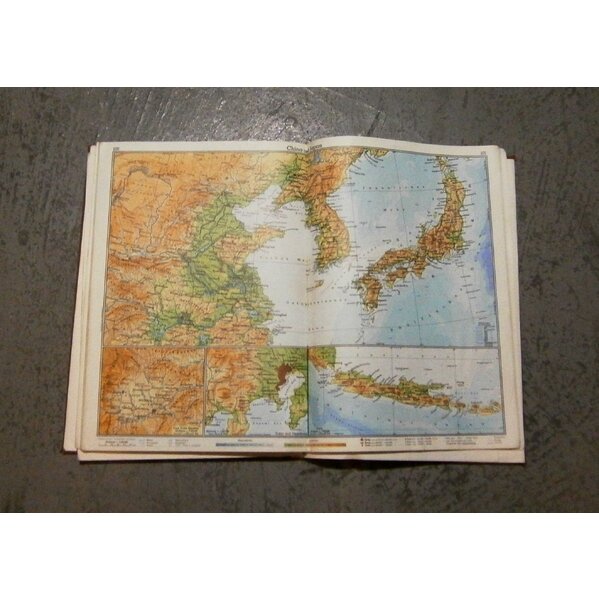 Alter Schulatlas in entsprechendem Großformat aus dem Jahr 1968. Laut einem Stempel auf dem Vorsatzblatt stammt er aus einer Schule und hat da wohl einiges erlebt. Da das Kartenmaterial aber noch schön ist, könnte man das altehrwürdige schwere Teil eventuell noch zum Basteln verwenden. Als Zeitdokument wäre er sicher interessant, müßte dafür aber restauriert werden.