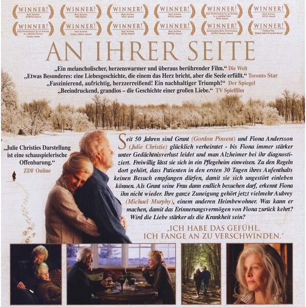 Der preisgekrönten kanadischen Schauspielerin Sarah Polley (siehe vor und hinter der Kamera u.a. in 'Das süße Jenseits' oder 'Mein Leben ohne mich') ist mit ihrem herausragenden Regiedebüt 'An ihrer Seite' alias 'Away from Her' (2006) ein ergreifender, herzerwärmender und unendlich zärtlicher Liebesfilm gelungen. Der Film handelt von der Kraft der Erinnerung und einer Liebe, wie sie erst durch ein langes gemeinsames Leben voller Höhen und Tiefen entstehen kann. Eine Hommage an die sensationelle Julie Christie, erzählt mit beeindruckender Einfühlsamkeit, leiser Ironie und ohne einen Hauch von falschem Kitsch. Der Film, der auf der Kurzgeschichte der kanadischen Autorin Alice Munro 'Der Bär kletterte über den Berg' basiert, gehörte bereits bei seiner Weltpremiere auf dem Filmfest in Toronto, beim Sundance-Filmfest sowie bei der Berlinale 2007 zu den Publikums- und Filmkritikerlieblingen.