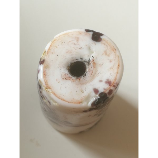 Anhänger in weiß mit Muster in aubergine, Länge 3cm, Durchmesser 2cm.