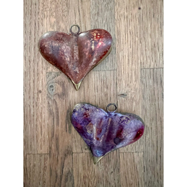 Zwei Anhänger in Herzform, ca. 5 cm hoch und 7 cm. breit, eins in Violett und eins in Braun/Bronze. Ich hatte die als Anhänger an einem Lederband.