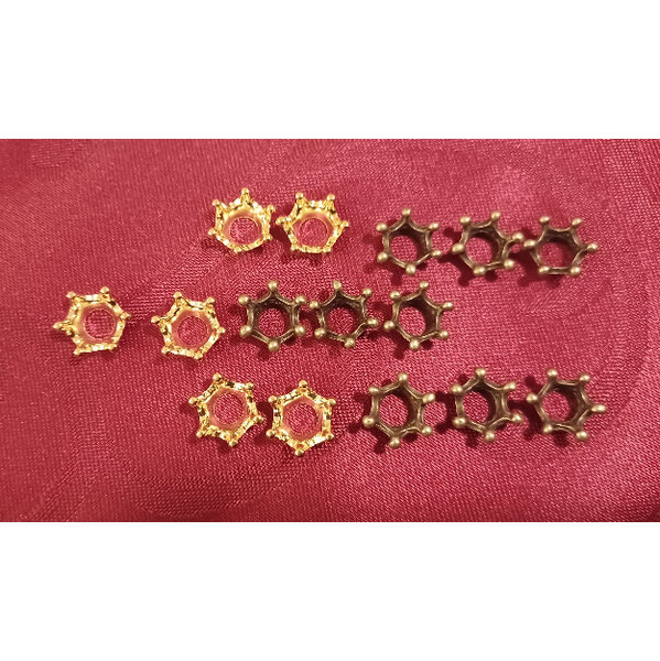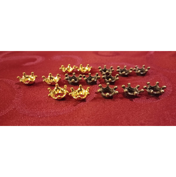 6 goldene und 9 bronzenfarbene Kronen z.B. für Glückswürmchen, Prinzen etc. Größe ca. 1cm Durchmesser Zacken, Kopfteil etwas kleiner.
