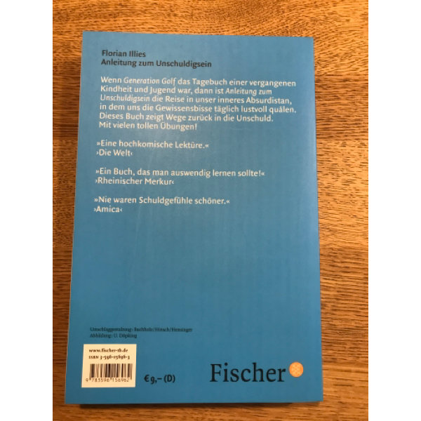 Du musst kein schlechtes Gewissen haben? Von wegen. Wenn »Generation Golf« das Tagebuch einer vergangenen Kindheit und Jugend war, dann ist »Anleitung zum Unschuldigsein« die Reise in unser inneres Absurdistan, in dem uns die Gewissensbisse täglich lustvoll quälen. Dieses Buch zeigt Wege zurück in die Unschuld. Mit vielen tollen Übungen! Bildlegende: Ich sollte mehr Sport machen. Ich sollte mein Fahrrad reparieren. Ich sollte nicht immer nur Gutscheine verschenken. Ich sollte mal wieder meine Mutter anrufen. Ich sollte mit dem Rauchen aufhören. Ich sollte mal wieder zum Zahnarzt gehen. Ich sollte weniger Geld für Kleidung ausgeben. Ich sollte mehr Obst essen. Ich sollte mal wieder die leeren Flaschen wegbringen.Florian Illies' Buch »Generation Golf« (Band 15065) erschien 2001 im Fischer Taschenbuch Verlag.