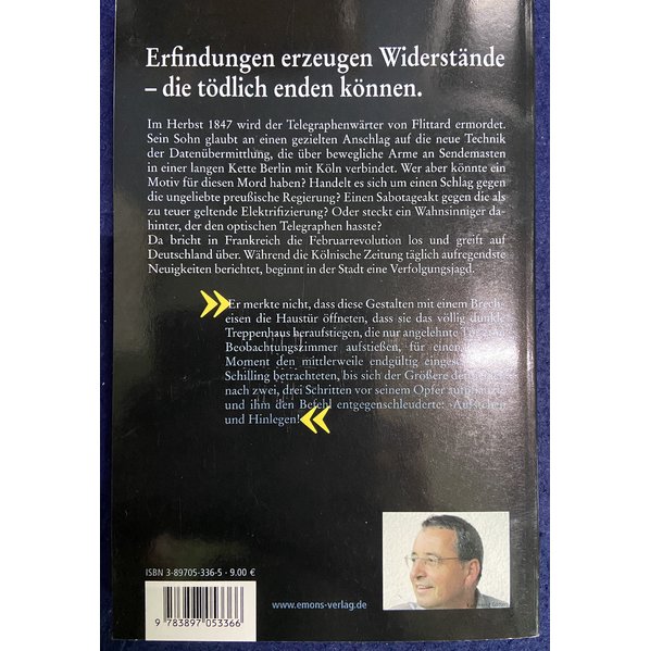 Im Herbst 1847 wird der Telegraphenwärter von Flittard ermordet. Sein Sohn Werner glaubt an einen gezielten Anschlag auf die neue Technik der Daten-übermittlung, die über bewegliche Arme an Sendemasten in einer langen Kette Berlin mit Köln verbindet. Wer aber könnte ein Motiv für diesen Mord haben? Handelt es sich um einen Schlag gegen die ungeliebte preußische Regierung? Einen Sabotageakt gegen die als zu teuer geltende Elektrifizierung? Oder steckt ein Wahnsinniger dahinter, der den optischen Telegraphen hasste?