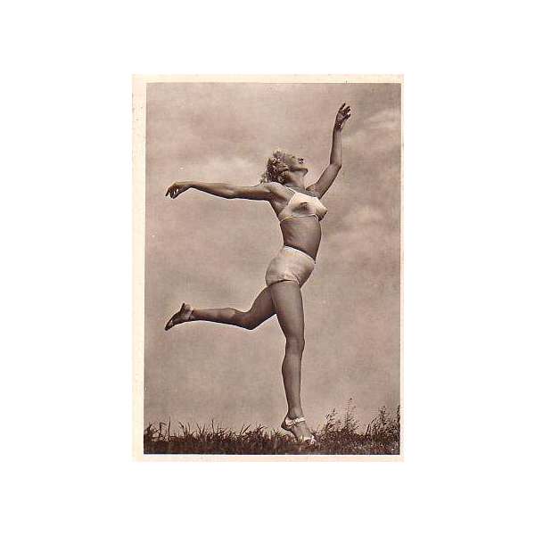 Uralte schwarz-weiß-Ansichtskarte mit einer feschen, beschwingten Sportlerin. Der Text hinten auf der Karte besagt: Schönheit der Gymnastik. Der schöne Schwung.
