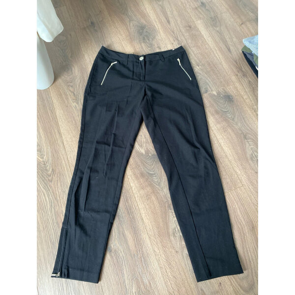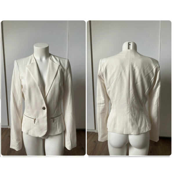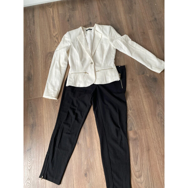 Eine schöner Anzug, bestehend aus weißem Blazer und schwarzer Stoffhose. Beides ist aus der gleichen Kollektion, Reisverschlüsse passen zusammen.