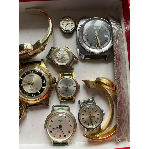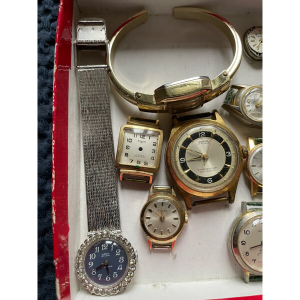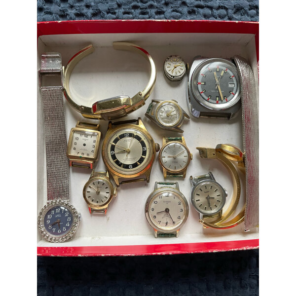Gebraucht, nicht funktionsfähig, nur zum Basteln! Die Goldenen sind nur vergoldet, kein Goldwert! 11 Uhren wie abgebildet.