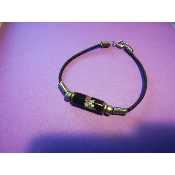 Am Armband mit Lederband befindet siche eine Keramik-Perle mit Blumendekor, ist von Metalleinfassung umgeben.