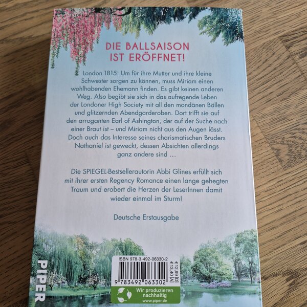 Es gibt keinen anderen Weg. Miriam muss einen wohlhabenden Ehemann finden, um für ihre Mutter und ihre kleine Schwester sorgen zu können. Deshalb verlässt sie die Ruhe und Geborgenheit ihrer geliebten Bücher und begibt sich in das aufregende Leben der Londoner High Society mit all ihren mondänen Bällen und glitzernden Abendgarderoben. Dort trifft sie auf den kühlen, arroganten Earl of Ashington, der auf der Suche nach einer Frau ist – und Miriam nicht aus den Augen lässt. Doch auch das Interesse seines charismatischen Bruders Nathaniel ist geweckt, dessen Absichten allerdings ganz andere sind …