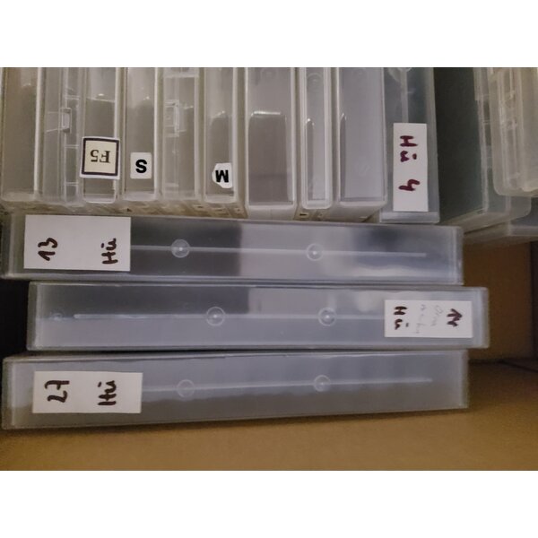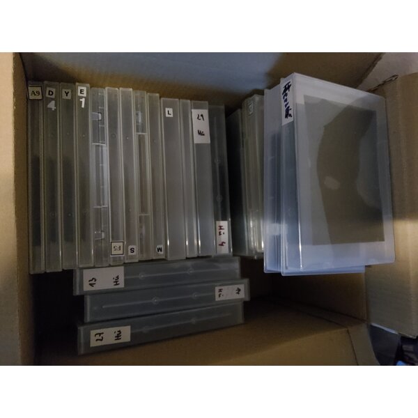 Es ist ein ganzer Karton voller gebrauchter und beklebter Aufbewahrungsboxen. Ein Teil ist so breit wie eine DVD Box, ein Teil doppelt so dick und ein paar noch breiter. Alle sind noch voll in Ordnung, nur eben noch mit Aufklebern und einige haben Magnetstreifen innen ( da hatte ich Stanzen aufbewahrt) . Es sind aber keine Medienboxen. Im Innern sind sie ohne Aufnahme für DVDs oder Ähnliches. Herrlich für die Aufbewahrung von Stanzen, Stempeln und anderem Kleinkram.
