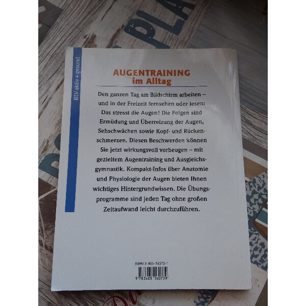 Anatomie und Physiologie der Augen, Erkrankungen und andere Einflüsse auf die Sehfähigkeit. Programme für funktionelle Gymnastik, Augentraining und Entspannung. Bildschirmtätigkeit, Arbeitsplatz-Einrichtung, Brillen.