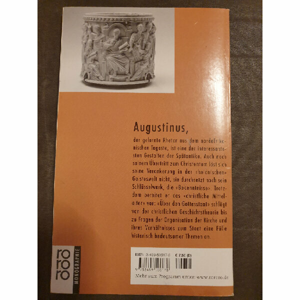 Augustinus (354-430), der gelernte Rhetor aus dem nordafrikanischen Tagaste, ist eine der interessantesten Gestalten der Spätantike. Auch nach seinem Übertritt zum Christentum löst sich seine Verankerung in der "heidnischen" Geisteswelt nicht, sie durchsetzt noch sein Schlüsselwerk, die "Bekenntnisse". Trotzdem bereitet er das "christliche Mittelalter" vor: "Über den Gottesstaat" schlägt von der christlichen Geschichtstheorie bis zu Fragen der Organisation der Kirche und ihres Verhältnisses zum Staat eine Fülle historisch bedeutsamer Themen an.