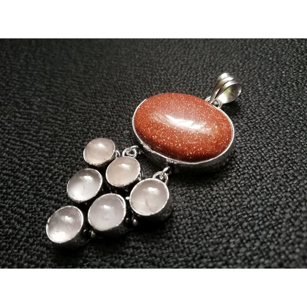 Zauberhafter Anhänger aus einem ovalen Goldflusscabochon, kombieniert mit einem an zwei Ringen befestigen Dreieck, bestehend aus sechs runden Rosenquarzelementen.