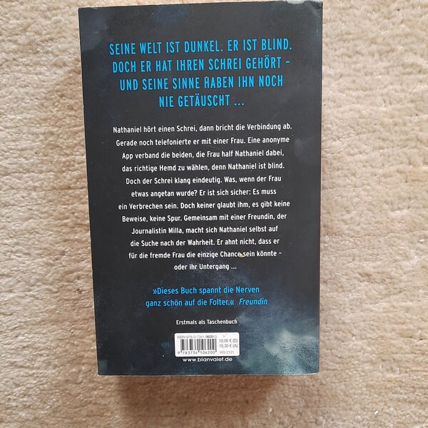 Seine Welt ist dunkel. Er ist blind. Nathaniel hört einen Schrei, dann bricht die Verbindung ab. Gerade noch telefonierte er mit einer Frau. Eine anonyme App verband die beiden, die Frau half Nathaniel dabei, das richtige Hemd zu wählen. Doch der Schrei klang eindeutig. Was, wenn der Frau etwas angetan wurde? Er ist sich sicher: Es muss ein Verbrechen sein. Doch keiner glaubt ihm, es gibt keine Beweise, keine Spur. Gemeinsam mit einer Freundin, der Journalistin Milla, macht sich Nathaniel selbst auf die Suche nach der Wahrheit. Er ahnt nicht, dass er für die fremde Frau die einzige Chance sein könnte – oder ihr Untergang.