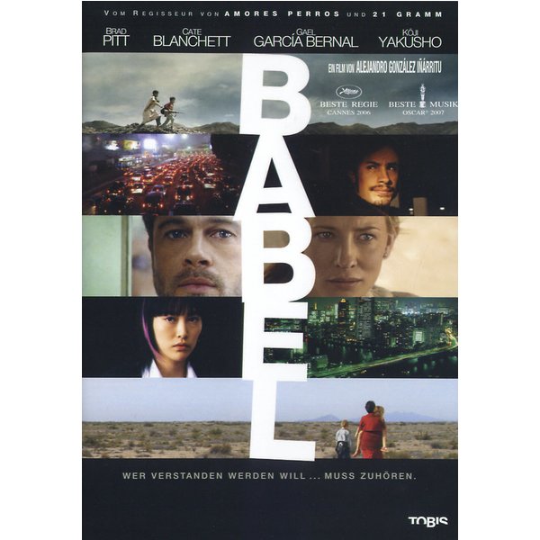 Klappentext: "Mit 'Babel' ist Alejandro González Inárritu ein flimisches Gesamtkunstwerk über Zufall und Schicksal, Ursache und Wirkung, Schuld und Sühne gelungen. - Ein Schuss in der Wüste von Marokko ist das auslösende Moment einer ganzen Kette von Ereignissen, die vier Schicksale von unterschiedlichen Menschen auf drei Kontinenten miteinander verbindet: Da ist ein amerikanischer Tourist, der in Marokko um das Leben seiner schwer verletzten Frau kämpft. Ein mexikanisches Kindermädchen, das verzweifelt versucht, die Grenze mit ihren beiden amerikanischen Schützlingen zu überqueren. Ein taubstummer japanischer Teenager, der gegen den eigenen Vater und dessen mysteriöse Vergangenheit rebelliert. Und zwei kleine Jungs auf der Flucht vor der eigenen Verantwortung. Geschichten und Schicksale, die nur scheinbar keine Verbindung haben..."