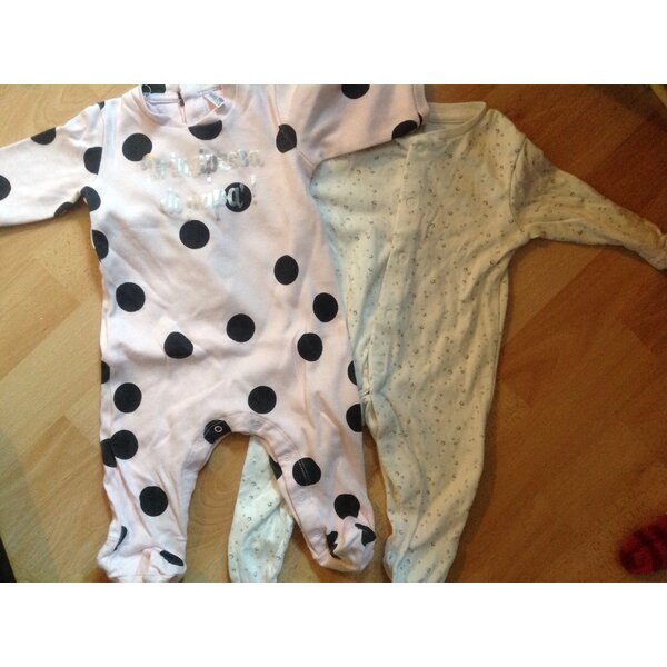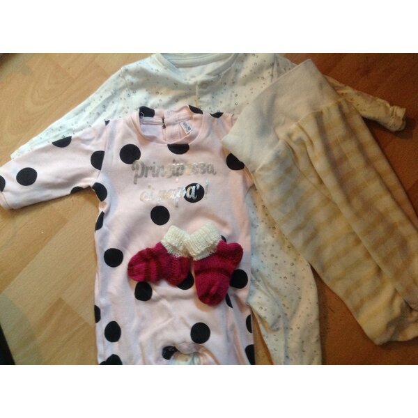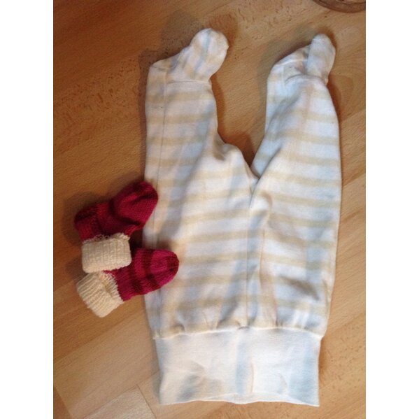 Siehe Fotos, 2 Strampler , Baumwolle und eine Nickivelours-Hose mit Breitem Bund, sowie ein Paar handgesteickte Söckchen , Synthetikfaser