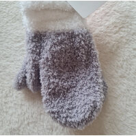 Schönes Set aus Strickmütze und Handschuhen in Größe 74cm (6-12 Monaten). Die Mütze in Grau zeigt ein Bärengesicht mit Ohren, die Handschuhe das ... mehr