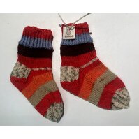 Handgestrickte Babysocken aus Sockenwolle von Woll Butt "Freeport! In rot, orange, grün, braun und blau. Feines Bündchen am Beinabschluss