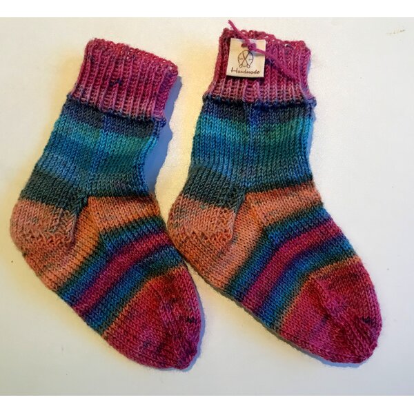 Handgestrickte Babysocken aus Sockenwolle von Woll Butt "Terni" in regenbogenfarbe. Feines Bündhen am Beinabschluss