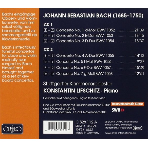 Konstantin Lifschitz has long since established himself as an outstanding exponent of the works of Johann Sebastian Bach. He has already recorded the 'Musical Offering´ and the 'Art of Fugue´ for ORFEO and now turns his attention to the composer´s seven keyboard concertos. He is partnered by the Stuttgart Chamber Orchestra, an ensemble that enjoys an equally distinguished reputation for its Bach interpretations. With only three of these seven concertos has it been possible to identify specific originals with different solo instruments, while the other four have been ascribed to various other instruments by experts in the field; attributions that none the less continue to be hotly debated. Lifschitz has at his command exactly the sort of touch and playful cunning needed to free the piano from its function as a continuo instrument and turns the whole experience into something intensely vital. The fact that he plays these works on a modern concert grand is wholly convincing, not least because in Bach´s day instruments were evolving all the time and Bach himself was fond of experimentation in this, as in so many other areas. The cyclical overview provided by Konstantin Lifschitz and the Stuttgart Chamber Orchestra in the case of the present recordings allows us to appreciate the old and the new in a clear and compelling way.
