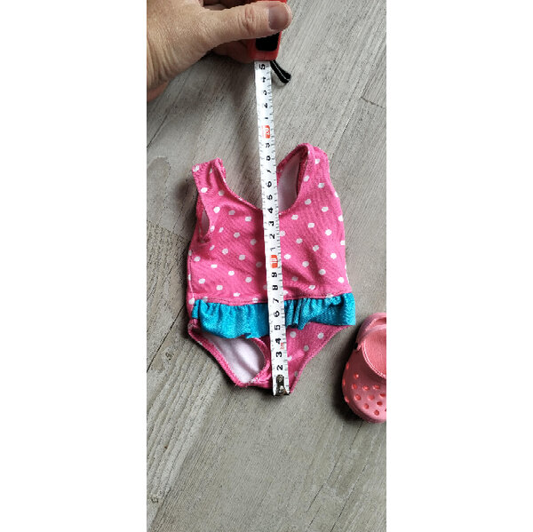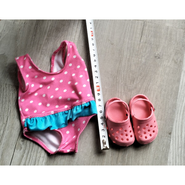 Badeanzug und Clogs-Schuhe für Puppen, beides von der Marke Heless. Größe siehe Fotos.