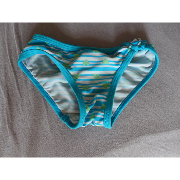 Praktische Badehose für kleine Mädchen. Hatten wir im Schwimmbad meist als Ersatz dabei, falls noch eine trockene Badehose gebraucht wird, nimmt in der Badetasche kaum Platz weg. Farbe: Türkis mit Herzchen-Motiv. Ich glaube von C&A.