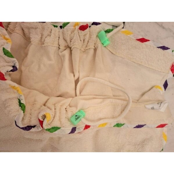 Grosses Frotteetuch zum Umziehen im Schwimmbad, wird mit Knöpfen, Klettverschluss und Kordelzug geschlossen. Darunter kann man dann die nassen Badesachen wechseln. Bei 60 Grad maschinenwaschbar. 93 % Baumwolle 7 % Polyester