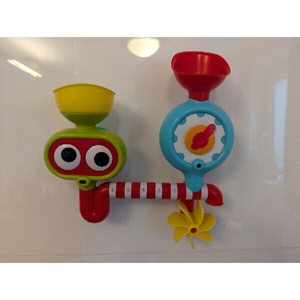 Badewannen-Spielzeug: Augen, Zeiger und Propeller bewegen sich, wenn man Wasser reinlaufen lässt, der gelbe Trichter ist abnehmbar
