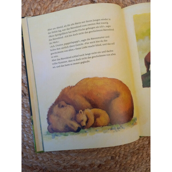 Einst lebte in den Bergen eine Bärin mit ihrem Kind. Das hatte so strahlende Augen und glänzendes Fell, dass die Bärenmutter ihr Kleines für das schönste der Welt hielt. Das Bärenkind wuchs heran. Als es bemerkte, dass andere Bärenkinder auch hübsch sind, wurde es sehr traurig. Bis eines Tages ein hungriger alter Bär das kleine Bärenkind um Hilfe bat. Da merkte das Bärenkind, dass es zwar nicht das schönste von allen war, aber dafür geschickt genug, einen hilflosen alten Bären vor dem Verhungern zu retten.