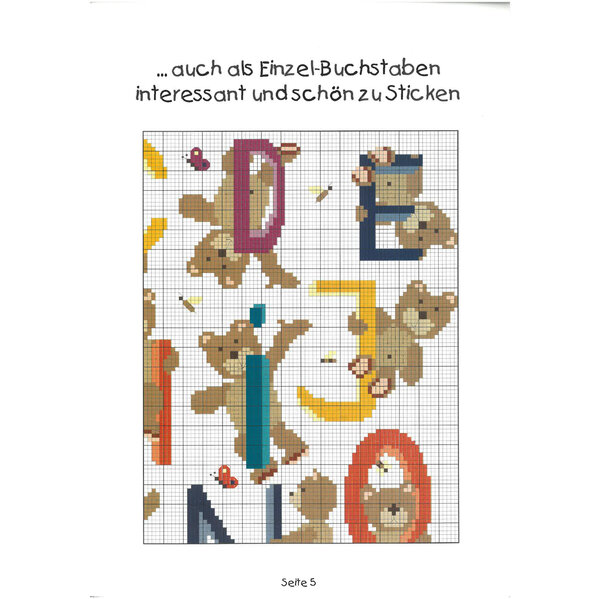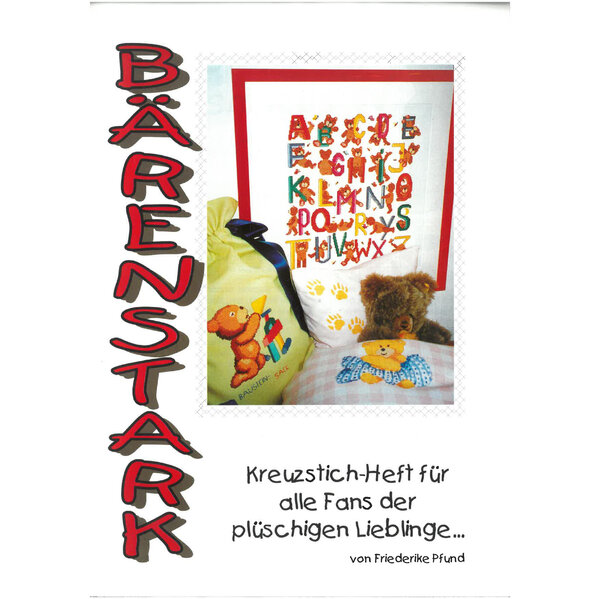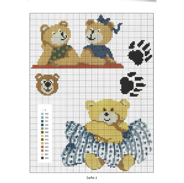 Hier sind viele Kreuzstich-Stickmuster mit Bären-Motiven farbig abgebildet. Die Farbcodes sind ebenfalls farbig zu sehen.