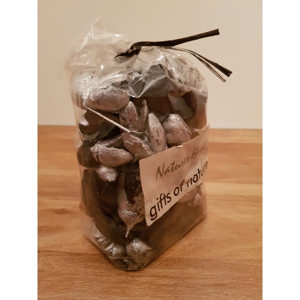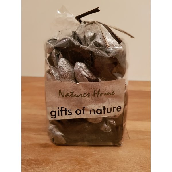 silbern und schwarz gefärbte Bakuli Pods als Streudeko zB für Tischdeko