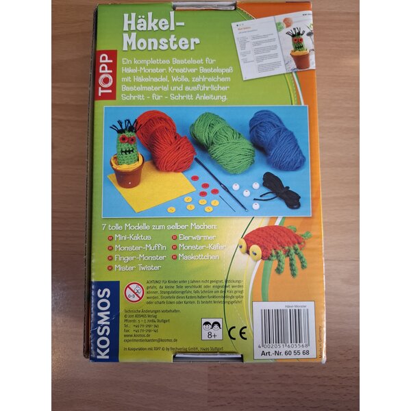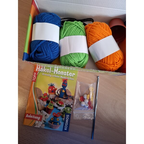 Ein komplettes Bastelset für Häkel-Monster. Kreativer Bastelspaß mit Häkelnadel, Wolle, Bastelmaterial und Schritt - für - Schritt - Anleitung.