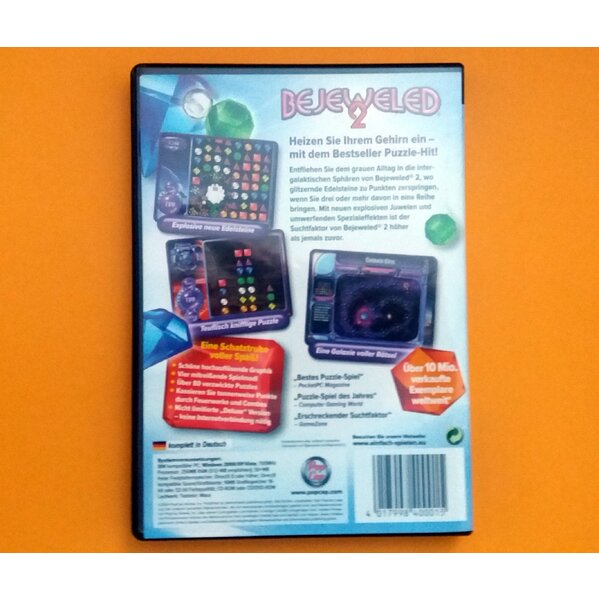Heizen Sie Ihrem Gehirn ein - mit dem Bestseller Puzzle-Hit! Entfliehen Sie dem grauen Alltag in die intergalaktischen Sphären von Bejeweled 2, wo glitzernde Edelsteine zu Punkten zerspringen, wenn Sie drei oder mehr davon in eine Reihe bringen. Mit neuen explosiven Juwelen und umwerfenden Spezialeffekten ist der Suchtfaktor von Bejeweled 2 höher als jemals zuvor. FEATURES: - Schöne hochauflösende Grafik - Vier mitreißende Spielmodi - Über 80 verzwickte Puzzles - Kassieren Sie tonnenweise Punkte durch Feuerwerke und Combos - Nicht limitierte "Deluxe" Version - keine Internetverbindung nötig.