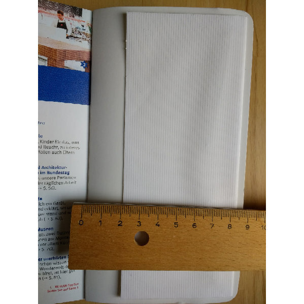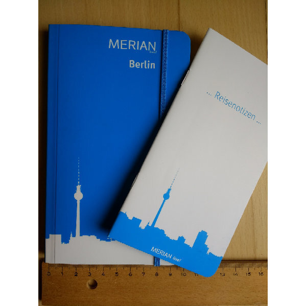 Im hinteren Einband hält eine Tasche Notizen fest, das Büchlein kann mit einem Spanngummi geschlossen werden. Ein im Format etwas kleineres Heftchen für Reisenotizen ist auch als Lesezeichen nützlich.