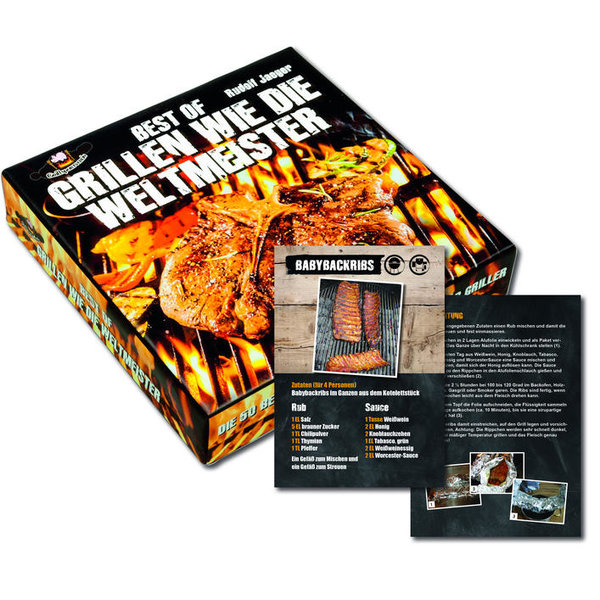 Grillen wie die Weltmeister – Die Rezepte – Box präsentiert Tipps und Tricks der Grillprofis im handlichen Format für drinnen und draußen. Die 50 leckersten Rezepte des deutschen Grillsportvereins bringen Abwechslung auf Ihren Grill und werden Sie und Ihre Gäste begeistern. Ob ausgefallene Grill-Ideen wie Churrasco mit Bärlauch-Chimichurri über Bison-Burger mit Wildkräutersalat und Walnusscreme bis hin zu Thunfisch-Steaks mit Sesam-Wasabi-Kruste und Fried Rice oder Basis-Anleitunge zur Brisket, Currywurst, Rub Ribs oder Chicken ...
