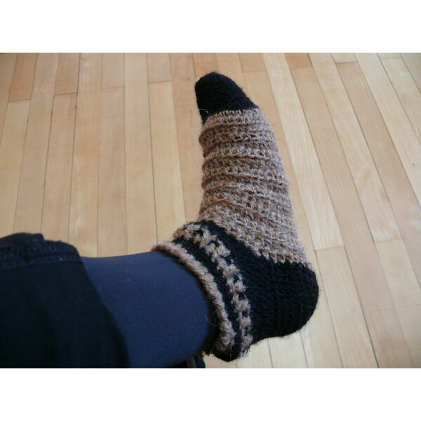 Bettschuhe aus Mohairgarn. Mittleres Braun und Schwarz. Können auch über die Socken gezogen werden um dann auf dem Sofa rumzulümmeln.