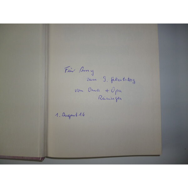 Widmung auf der ersten Seite (siehe Foto), Preis auf der Rückseite vom Einband durchgestrichen, angegilbter Buchschnitt.