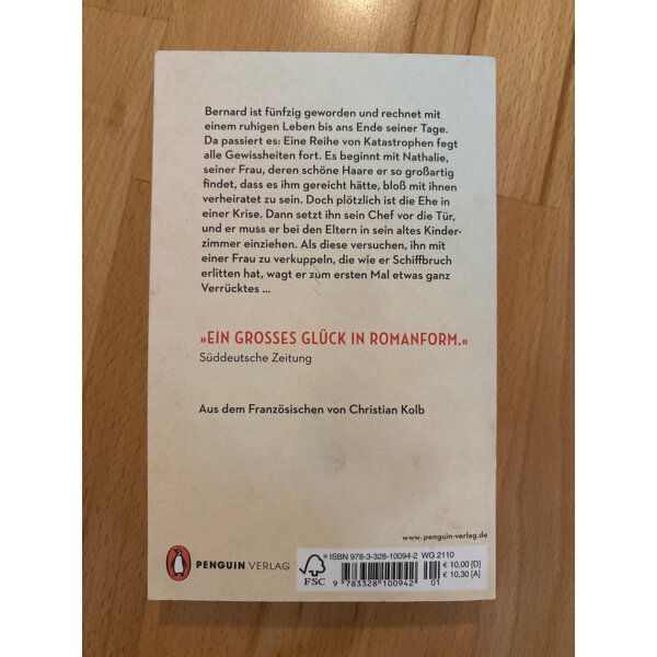 Bernard ist fünfzig geworden und rechnet mit einem ruhigen Leben bis ans Ende seiner Tage. Da passiert es: Eine Reihe von Katastrophen fegt alle Gewissheiten fort. Es beginnt mit Nathalie, Bernards Frau mit den schönen langen Haaren, die er so großartig findet, dass es ihm gereicht hätte, bloß mit ihren Haaren verheiratet zu sein. Doch plötzlich ist die Ehe in einer Krise. Dann setzt ihn sein Chef vor die Tür, und mittellos, wie er ist, muss er bei den Eltern in sein altes Kinderzimmer einziehen. Als diese auch noch versuchen, ihn mit einer Frau zu verkuppeln, die wie er Schiffbruch erlitten hat, wagt er zum ersten Mal etwas ganz Verrücktes …