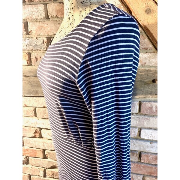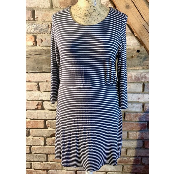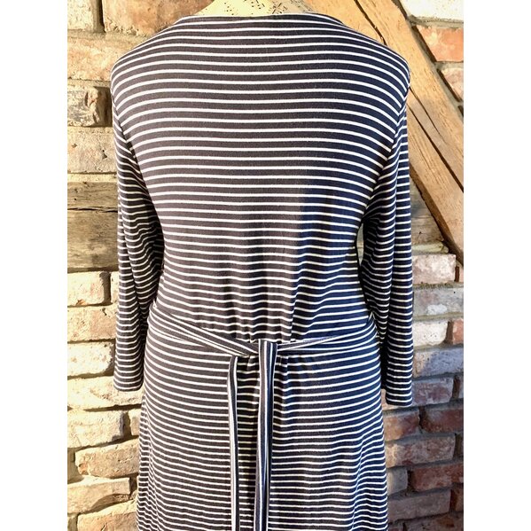 Legeres, blau-weiß geringeltes Kleid mit dreiviertel-Ärmeln - seitlich angenähte Bänder, die hinten gebunden werden - Jersey aus 95% Viskose 5% Elasthan - eher für Übergang und wärmere Jahreszeit, kein Winterkleid.