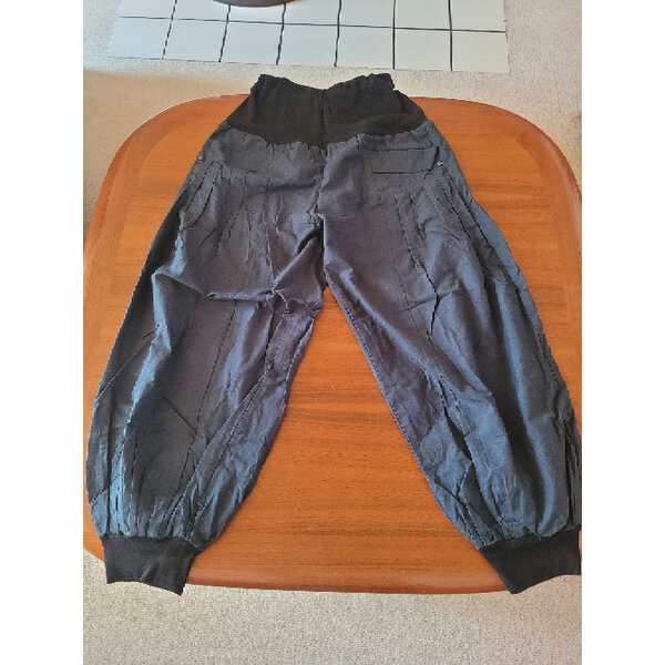 Blaue Pumphose mit schwarzen dehnbaren Bünden an Bauch und Beinen, zwei Taschen auf der Vorderseite