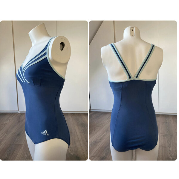 Toller sportlicher Badeanzug, Größenetikett und Materialangabe wurden herausgeschnitten, daher ist Größe geschätzt. Passte mir aber mit Gr. 38 sehr gut.