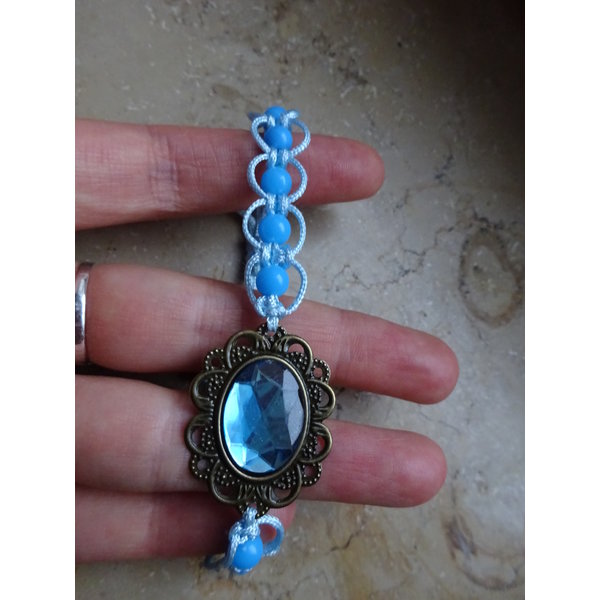 Von mir handgefertigtes Makramé-Armband mit blauen Perlen und Schiebeknoten, in der Mitte befindet sich eine bronzefarbene Fassung mit einem facettierten Cabochon.