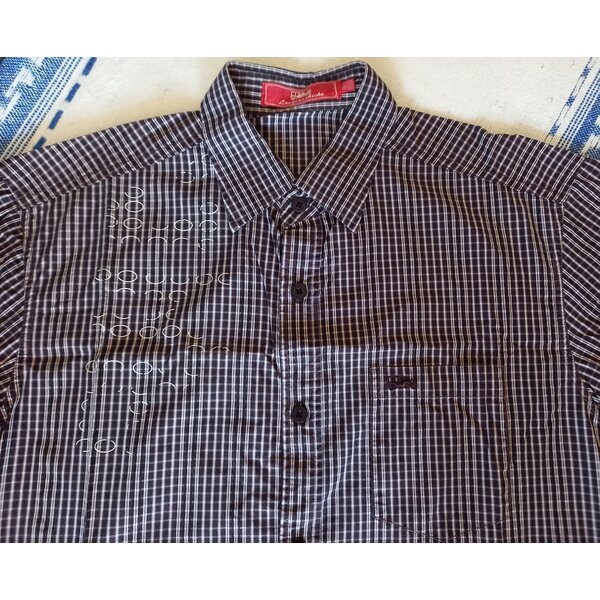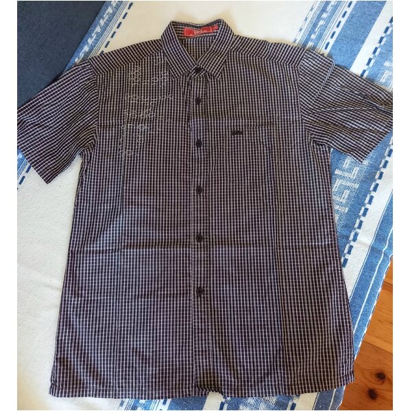 Bluse oder Hemd aus festerem Stoff, ich vermute Baumwolle, klein kariert. Vorn mit Kreisen, Halbkreis bedruckt. Auf der Tasche ist ein kleiner Oldtimer aufgedruckt.